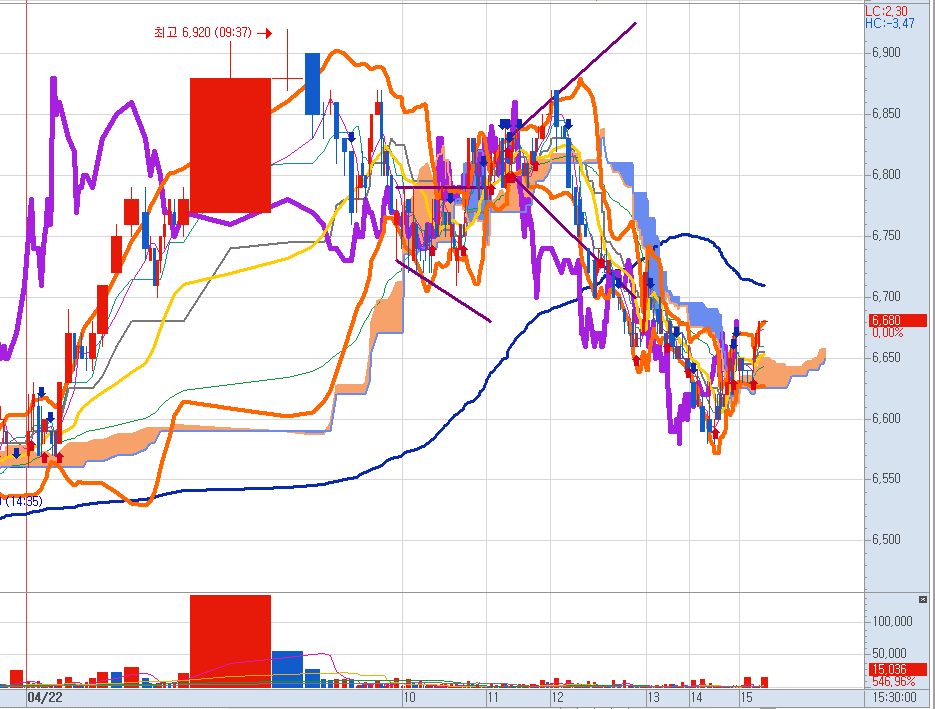 아래 분봉을 보면 어제 오늘 급등 신호를 만들면서 한 번 더 올렸습니다.