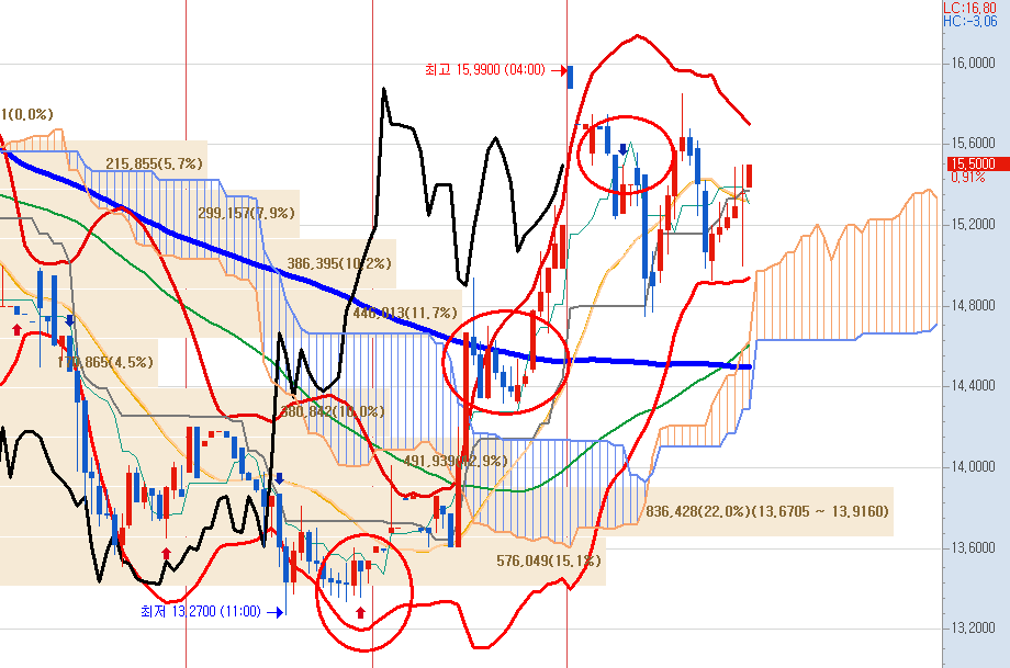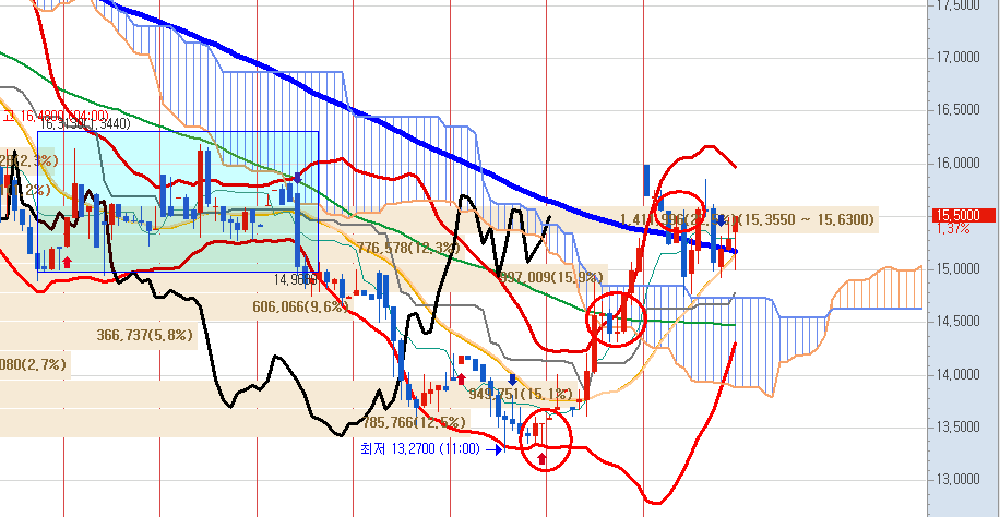장중 15.86까지 5.8%까지 상승했었지만 한 번에 넘기 힘든 자리였습니다.