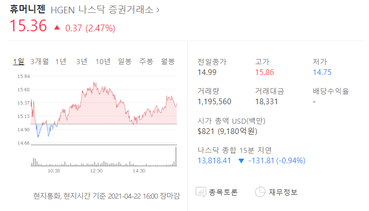 다시 본론으로 돌아와서 휴머니젠은 미국장 4월 22일 마감기준으로