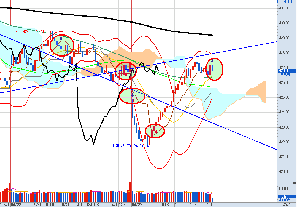 장 초반에 하락 후 매수 신호가 나오고 방금 매도신호가 나왔습니다.
