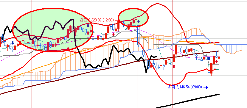 분봉을 보면 아직 반등이 기술적 반등에 그치고 있는 것을 볼 수 있습니다.