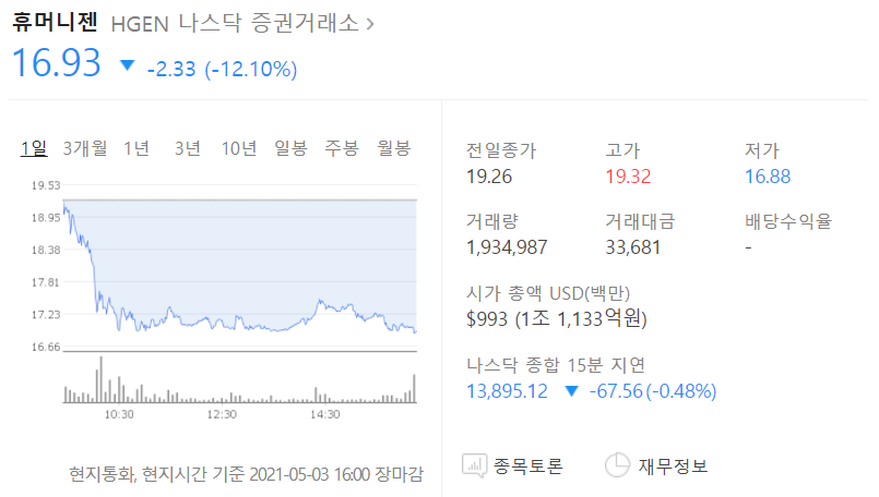 | 희망만 보인다! 휴머니젠(HGEN) 장 마감 시황 분석 (1) | 2021.05.01 |