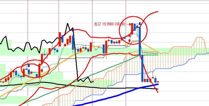 일봉상으로 쌍봉을 만들고 밀어냄으로 비교적 손쉽게 하락시킬 수 있었습니다.