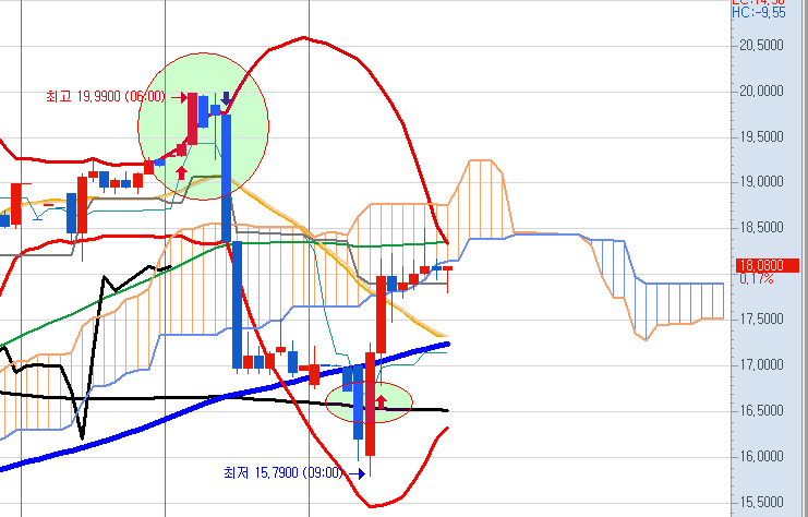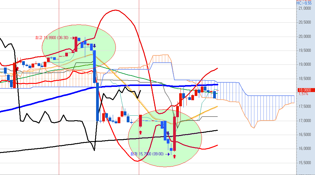 전일의 급락 신호를 주었던 원이 보입니다.