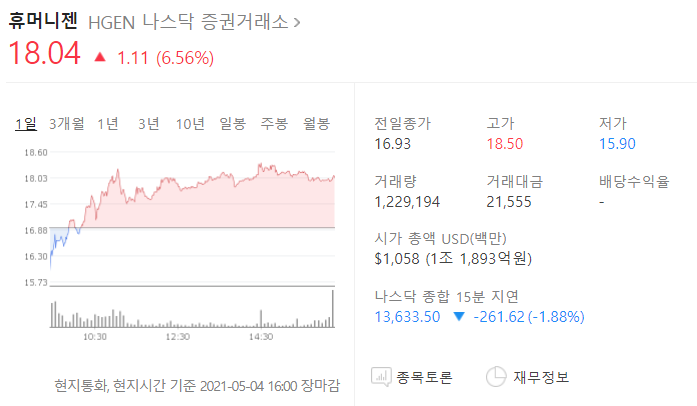 | 희망만 보인다! 휴머니젠(HGEN) 장 마감 시황 분석 (1) | 2021.05.01 |