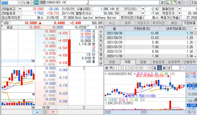 오늘 새벽 마감한 휴머니젠은 2.44% 상승한 18.5달러로 마감하였습니다.