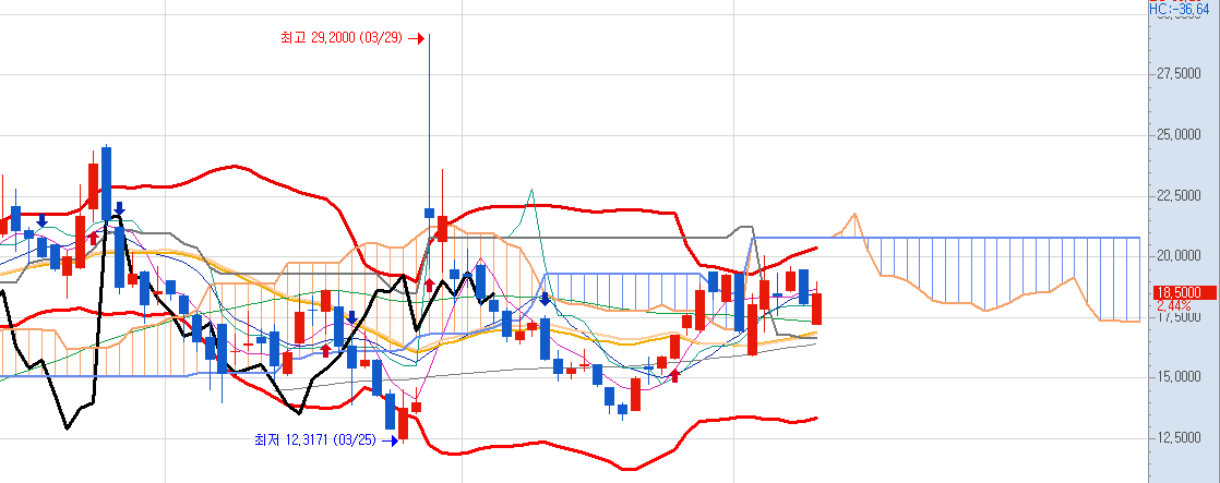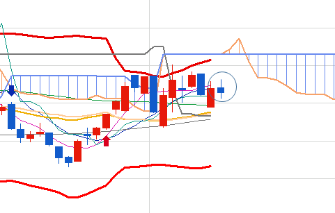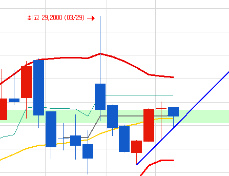 현재의 위치는 20일선과 볼밴의 중간 위치에 있습니다.