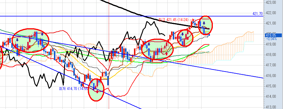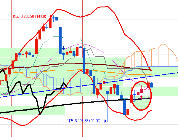 바로 패대기를 쳐서 추세선 아래에서 매도신호까지 발생시키고 마감한 모습입니다.