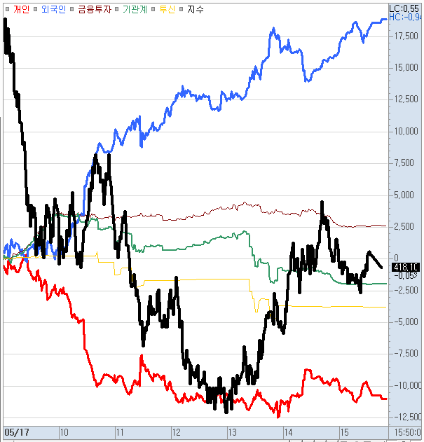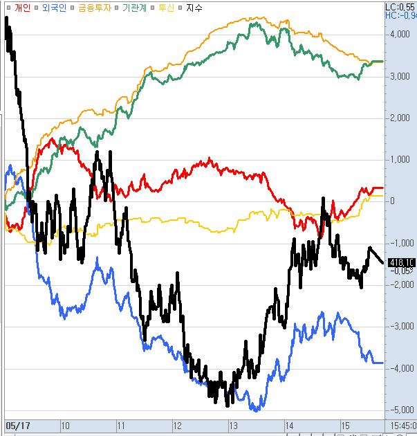 오늘 보니 외국인들은 계속 매도하고 있는 모습입니다.