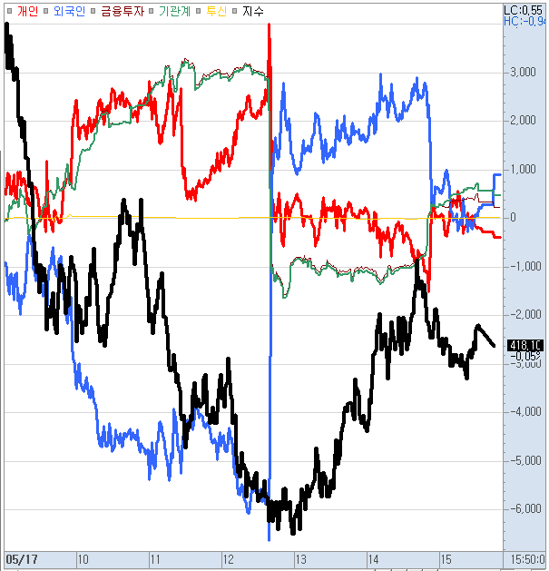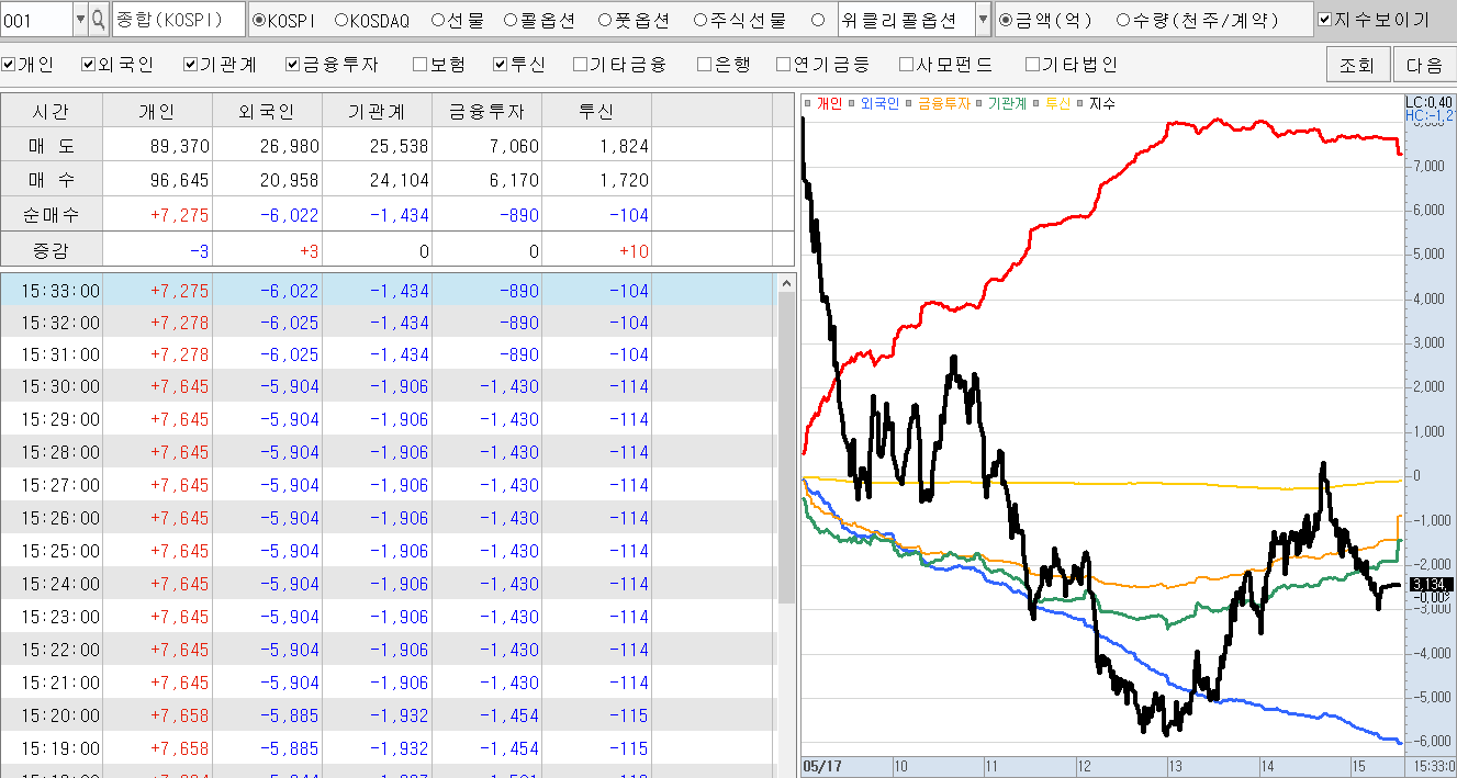 마감시점에서 개인은 7천억 이상 매수, 외국인은 6천억 이상 매도하였습니다.