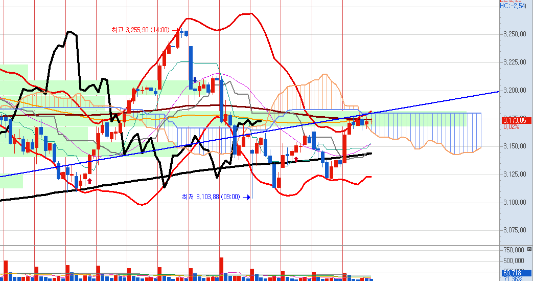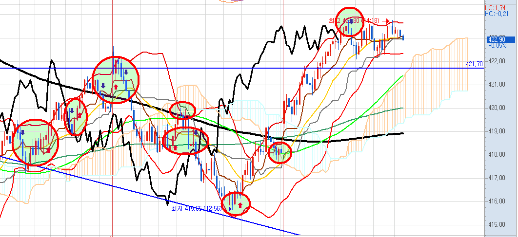 하지만 목요일 구간이 좋지 않기 때문에 분봉 조정이 오면 장중 하락이 올 수도 있을 것으로 보입니다.
