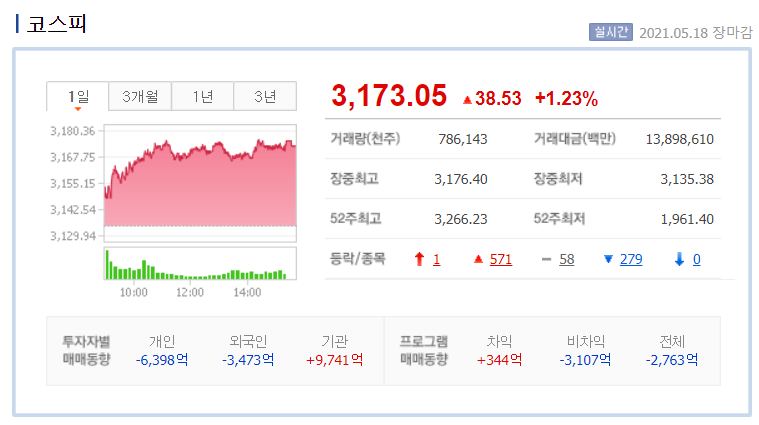 5월 18일 코스피 시장은 상승 마감했습니다.