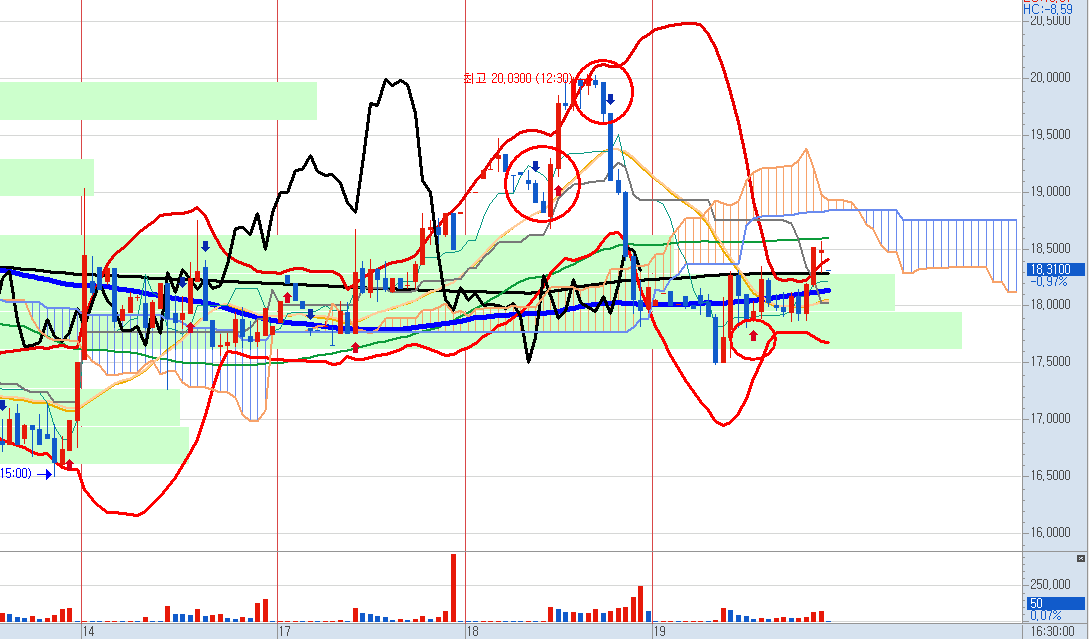 아래 추세선과 매물대를 발판으로 반등하였습니다.