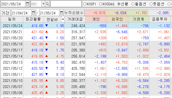 | 외국인이 끌어올린 장! 코스피 선물 시장 장 마감 시황 (0) | 2021.05.25 |