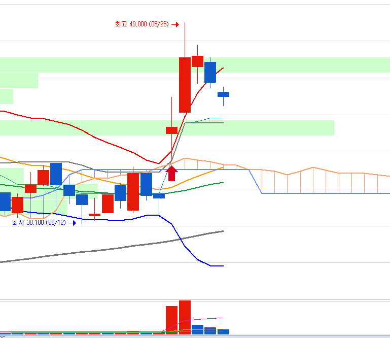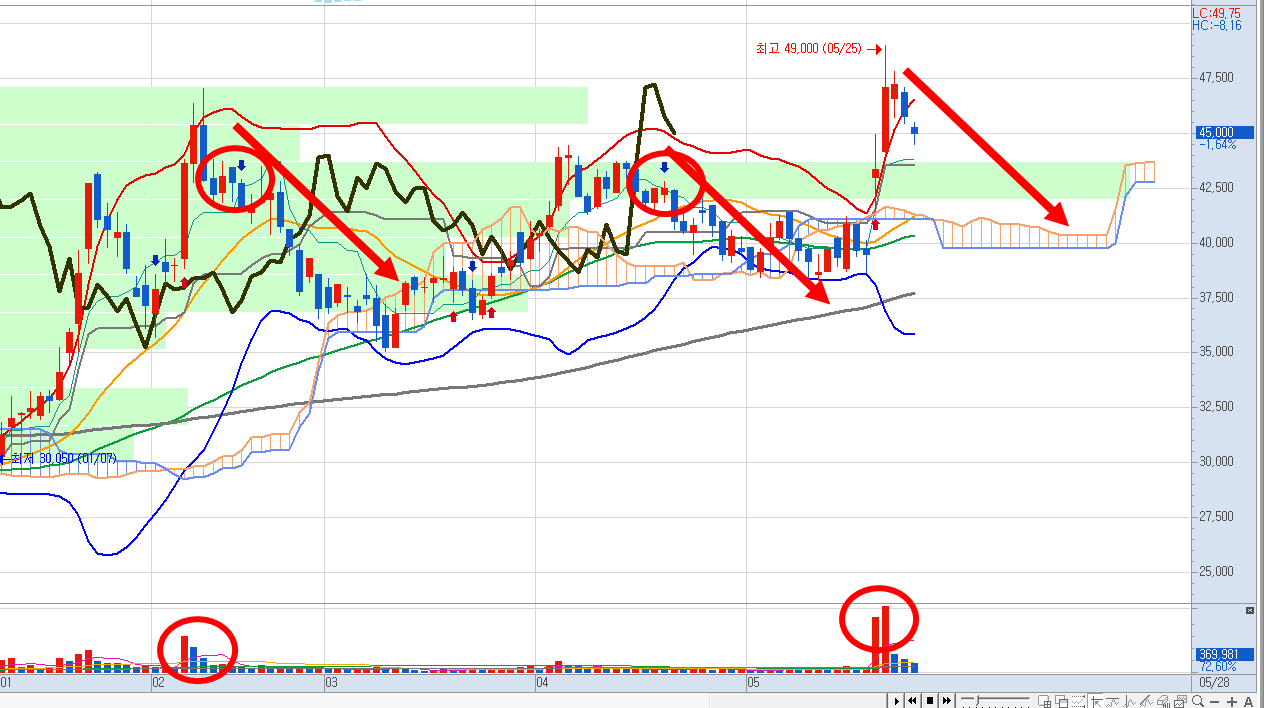 이대로 하락하면 매물대가 있는 43600원 근처까지 내려갈 것처럼 보입니다.