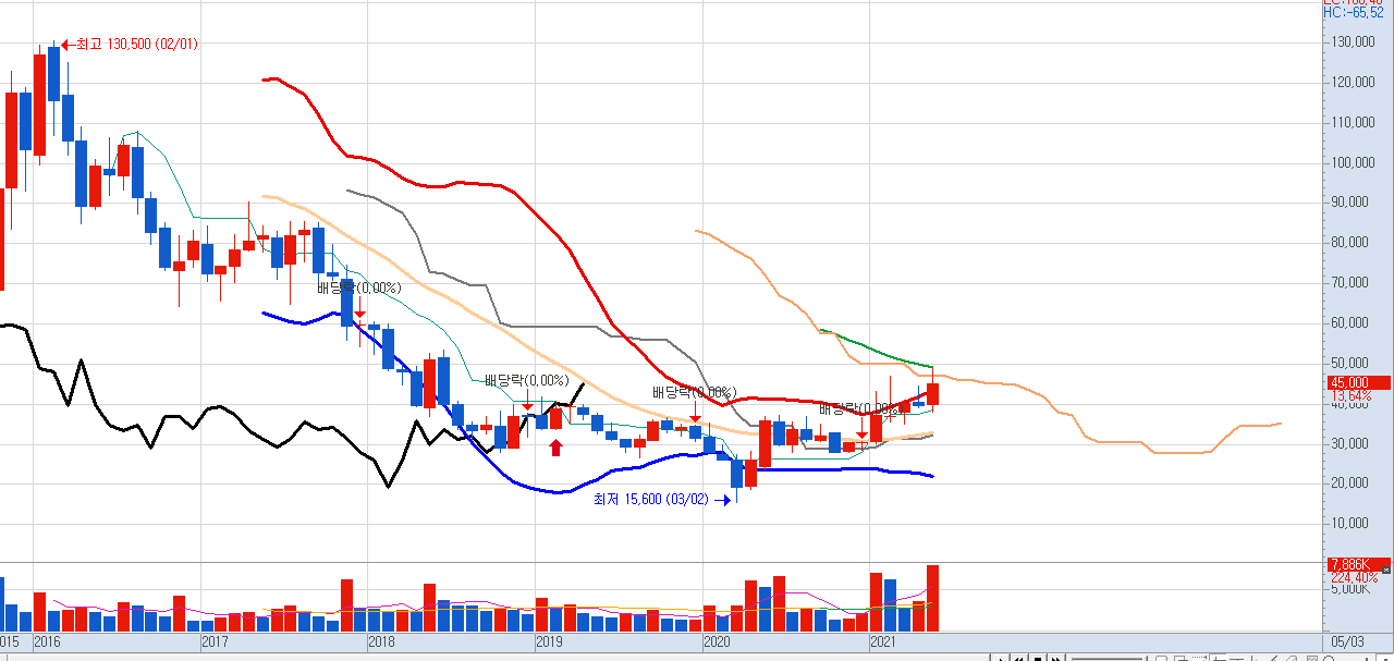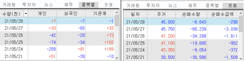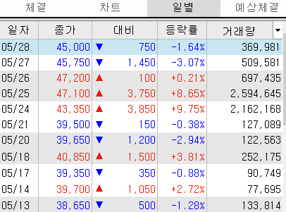 1.65% 하락한 45000원으로 마감했는데요,
