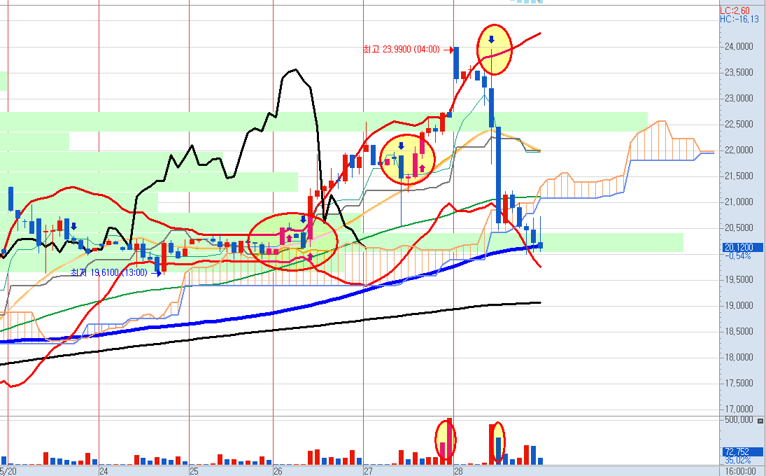 역시 급등 패턴이 나왔던 매물대까지 내려온 것을 볼 수 있는데요,