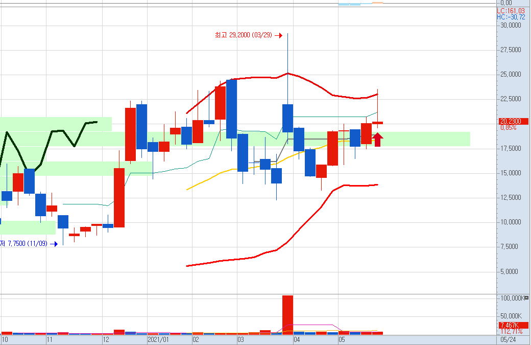 하락한 주가는 지난 상승을 위한 급등을 준비하던 그 매물대까지 내려와서 멈춰서 마감했습니다.