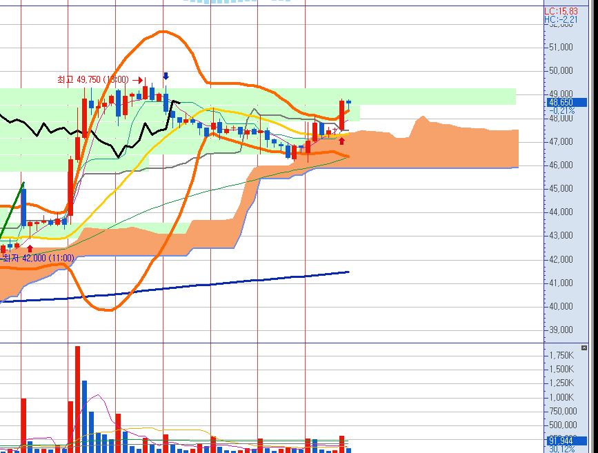 다만 월봉 볼밴 상단이 48000원에 있기 때문에