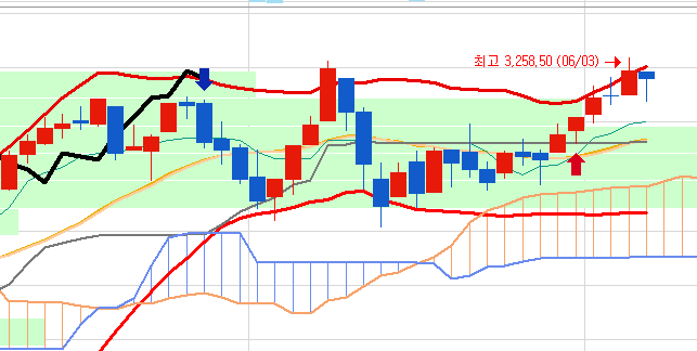 동시에 올라오는 이평선들을 보면 전체적인 상승추세는 여전하다는 것을 알 수 있습니다.