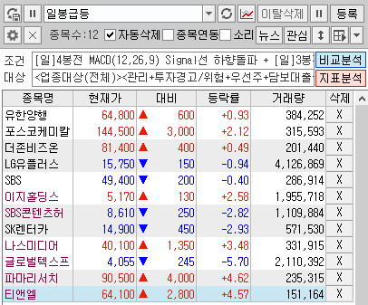 일봉 급등 식을 입력해서 검생한 종목 중에서