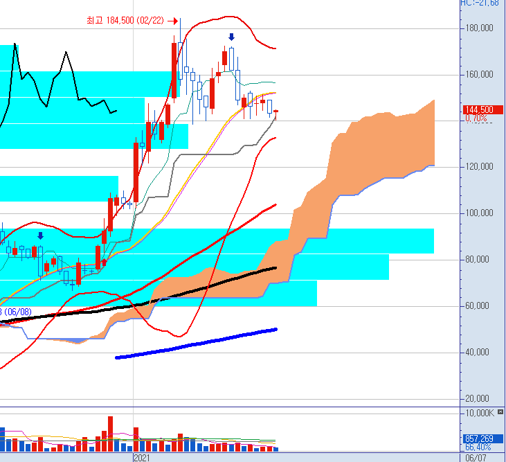 주봉으로 보면 급등 후에 조정이 진행되고 있습니다.