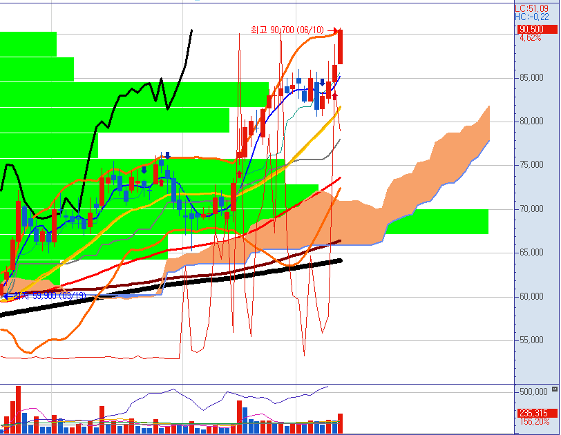 주봉으로 보니 상승이 무섭게 진행 중인 종목인 걸 실감할 수 있습니다.