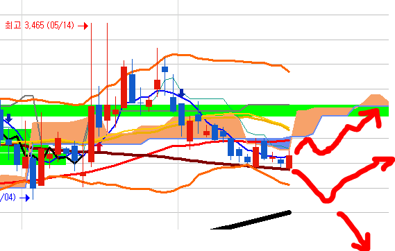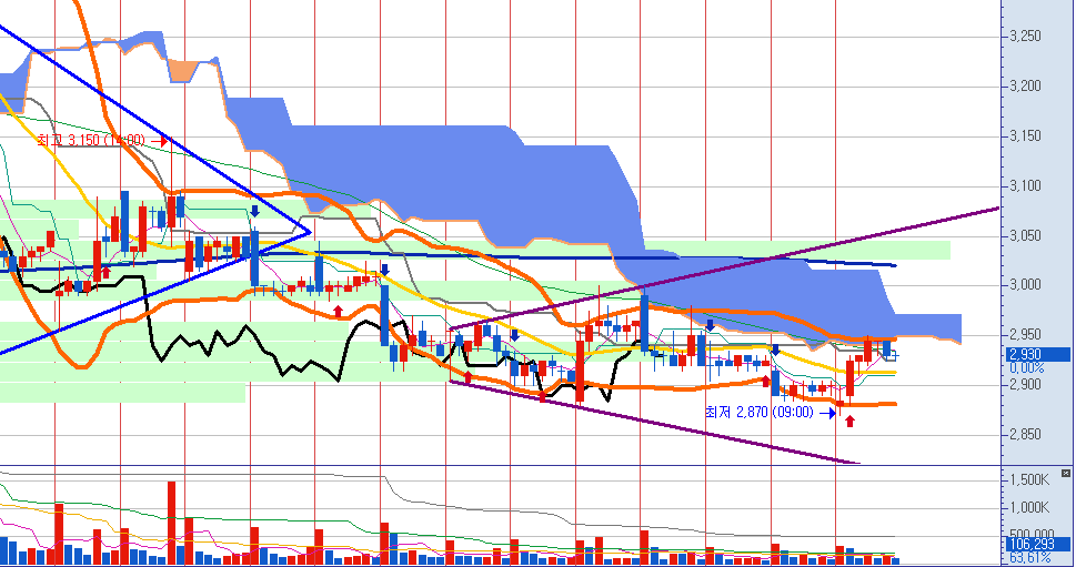 하지만 60일선의 3천원과 그 위의 20일 선이 저항으로 작용해서