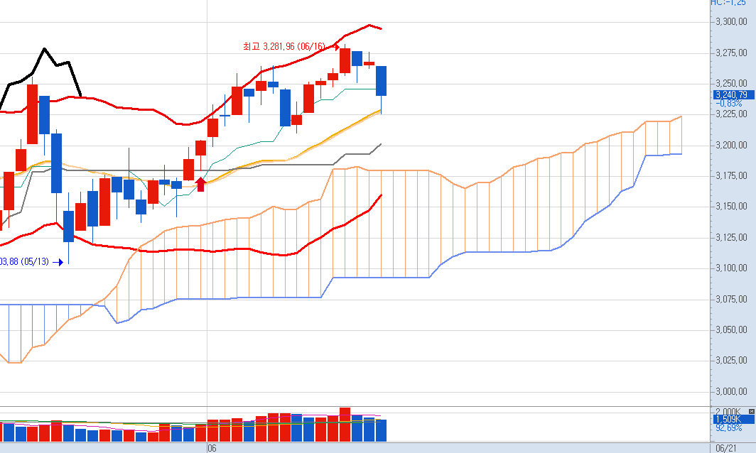 코스피 일봉은 하락은 했지만 구조는 지키고 있습니다.