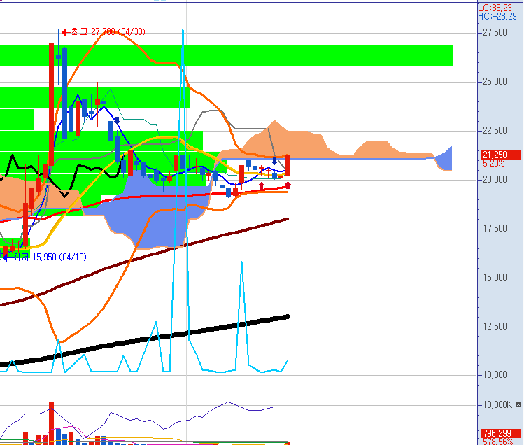 아래 주봉을 보면 최근의 상승세가 대단했던 것을 볼 수 있습니다.