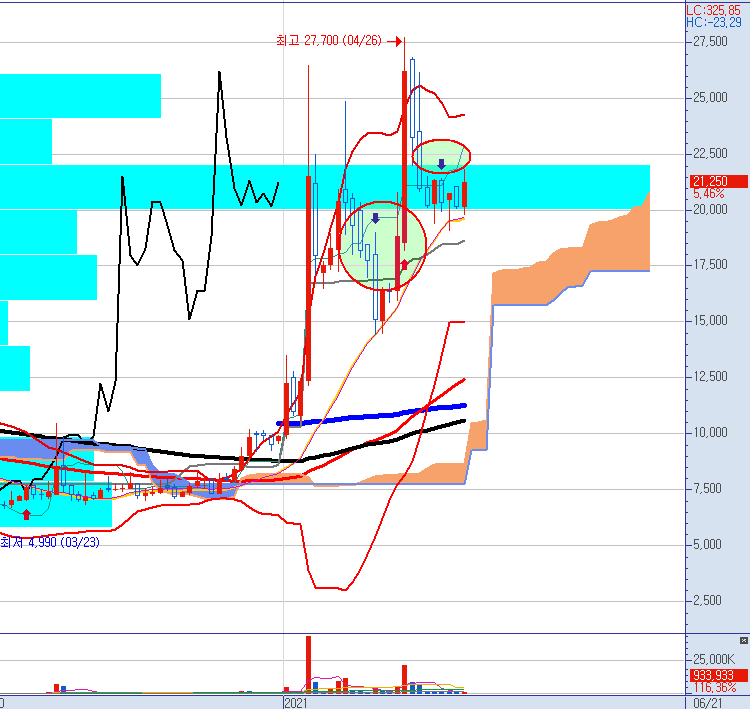 일봉으로도 볼밴 상단의 저항에 막혀 있습니다.
