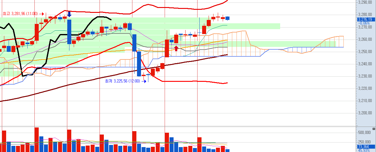 종가는 12.31포인트 상승한 3,276.19포인트로 0.38% 상승하였습니다.