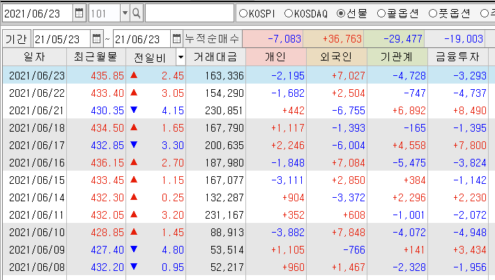 결국 금액으로 보면 양매도이지만 수량으로 보면 양매수가 되는 모습입니다.