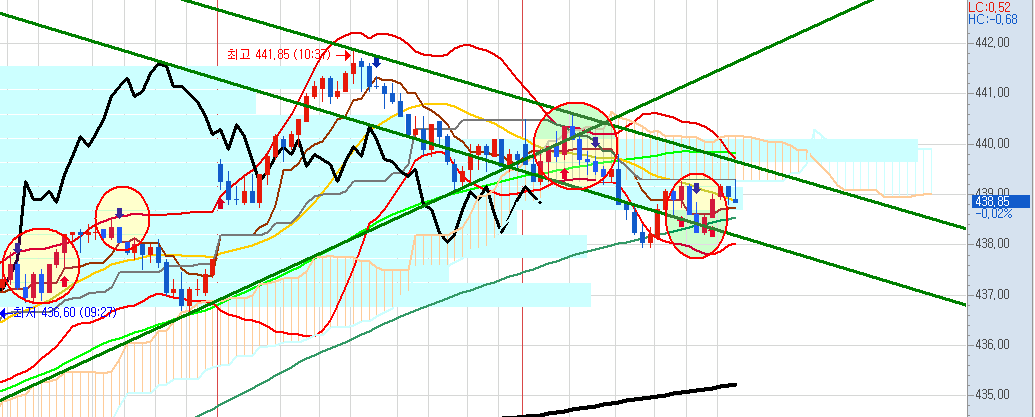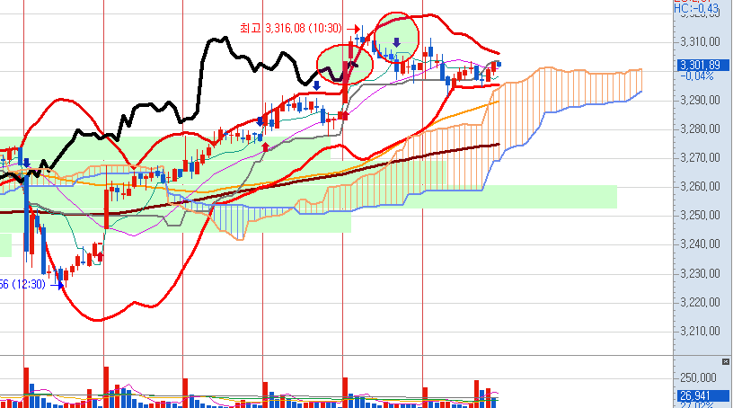 아래 코스피 30분 봉의 모습처럼 후행스팬의 데드크로스가 나오고