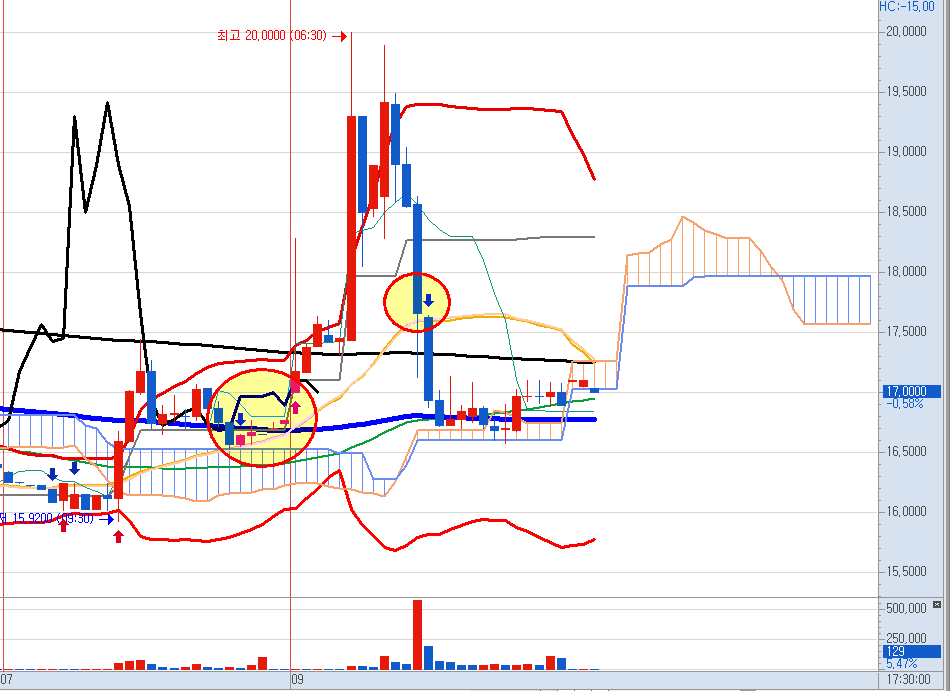 일봉에서 보이지 않았던 장 전의 흐름까지 볼 수 있는데요,