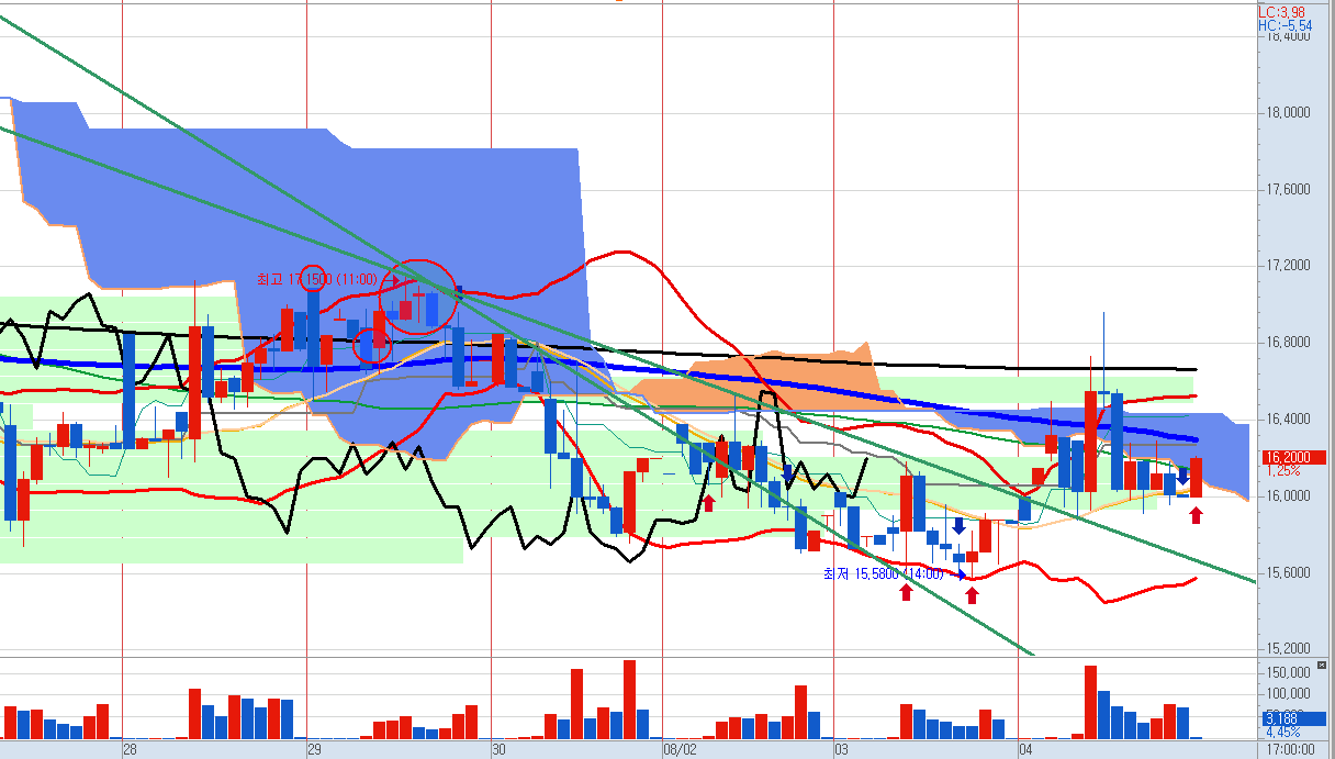 다만 그 동안 여러 번 밀렸던 이평선들의 다발에 밀려서 끝난 점은 아쉬운데요,