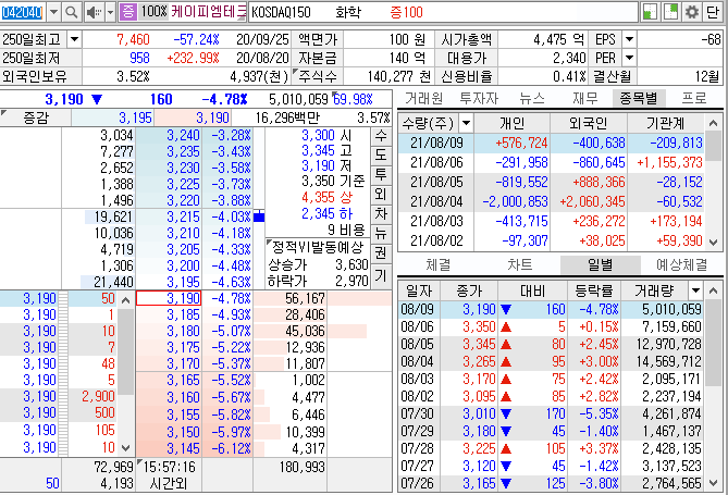 | 기관의 대량매수와 일봉 매수 신호 발생! 케이피엠테크(042040) 장 마감 시황 분석 (1) | 2021.08.06 |
