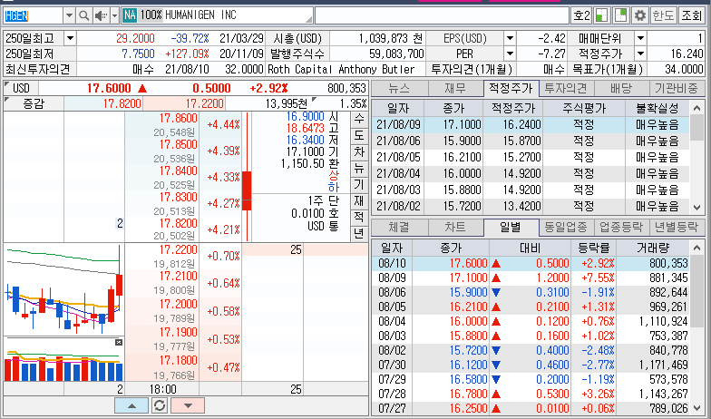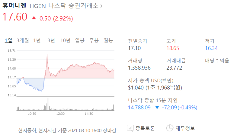 | 역시 한방! 휴머니젠(HGEN) 장 마감 시황 분석 (2) | 2021.08.10 |
