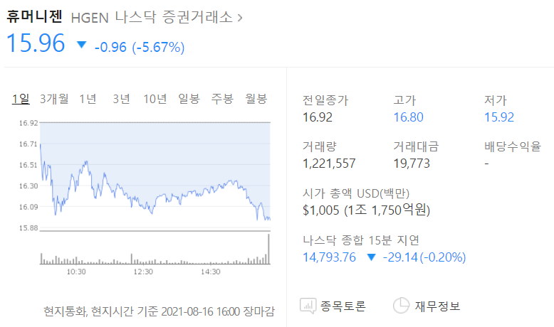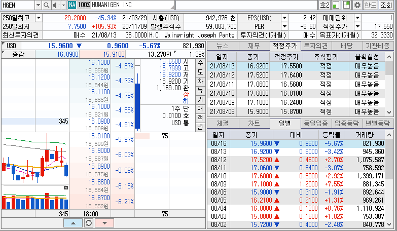| 선넘는 휴머니젠(HGEN) 장 마감 시황 분석 (0) | 2021.08.19 |