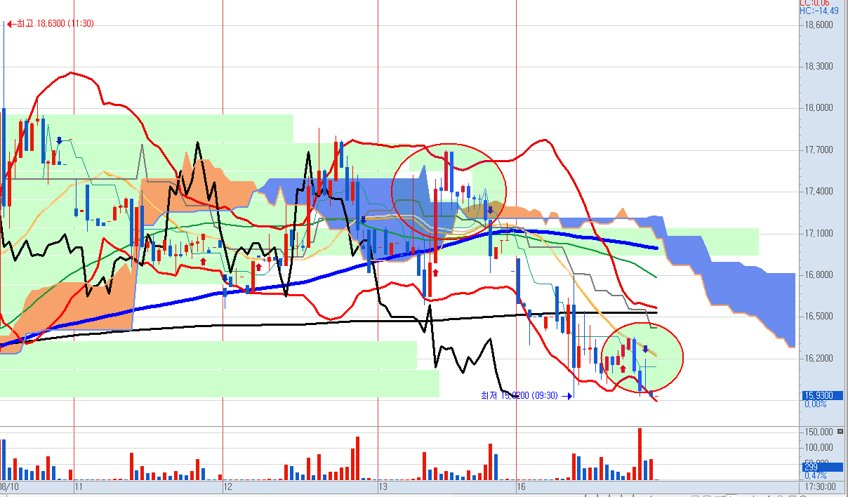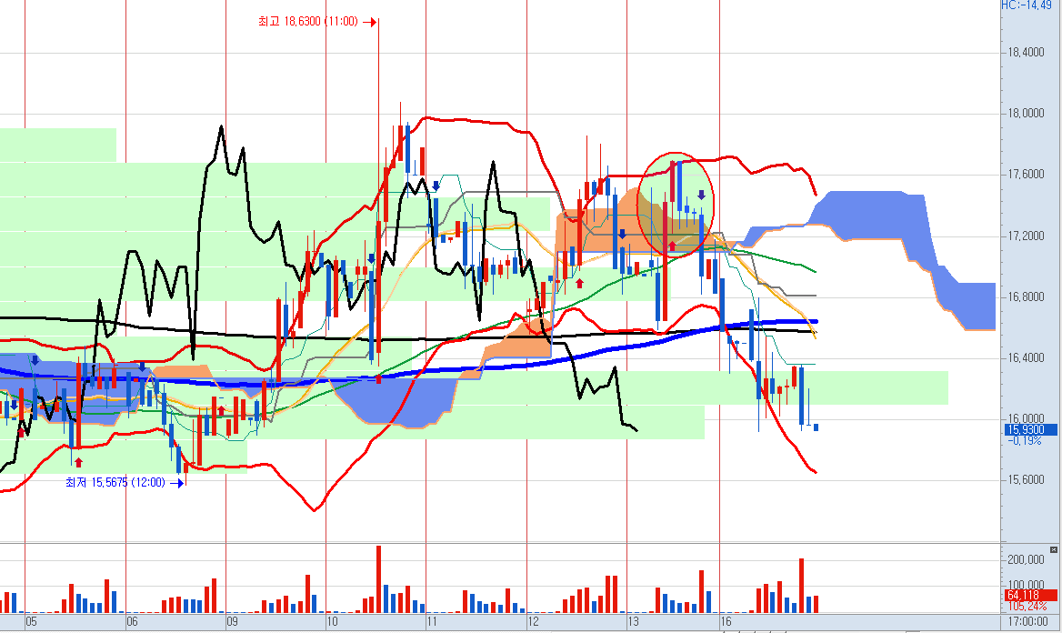 일봉을 보면 지난 주에 상승했던 양봉들을 거의 깨고 원점으로 돌려놓은