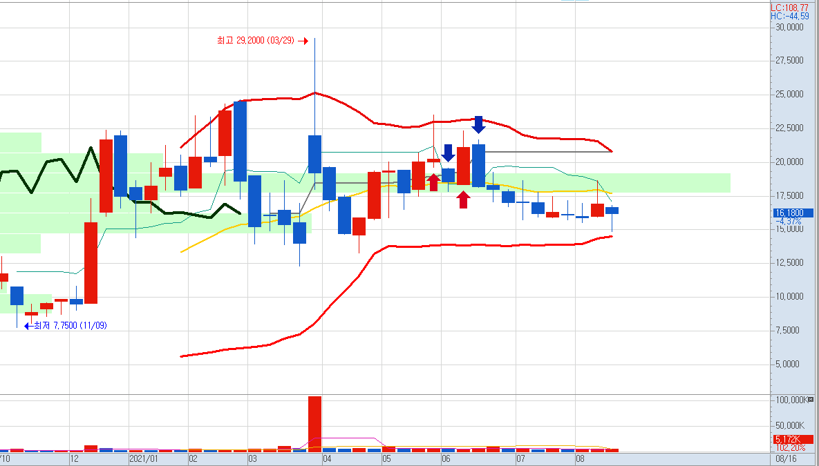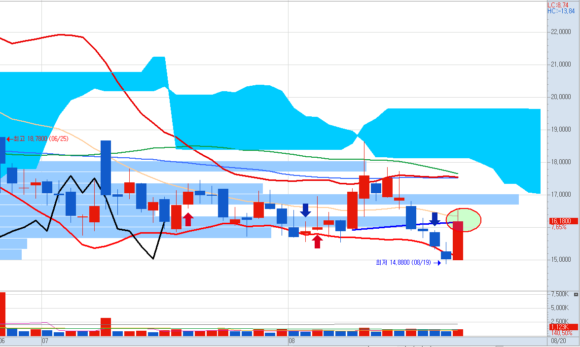 어제 글에서 말하려고 했던 주봉의 볼밴 하단 지지를 확인한 것으로 보입니다.