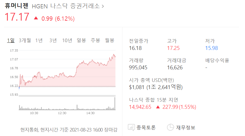 오늘 휴머니젠은 5.19% 상승한 17.02달러로 마감하였습니다. (키움 장 이후 가격까지 적용한 종가)