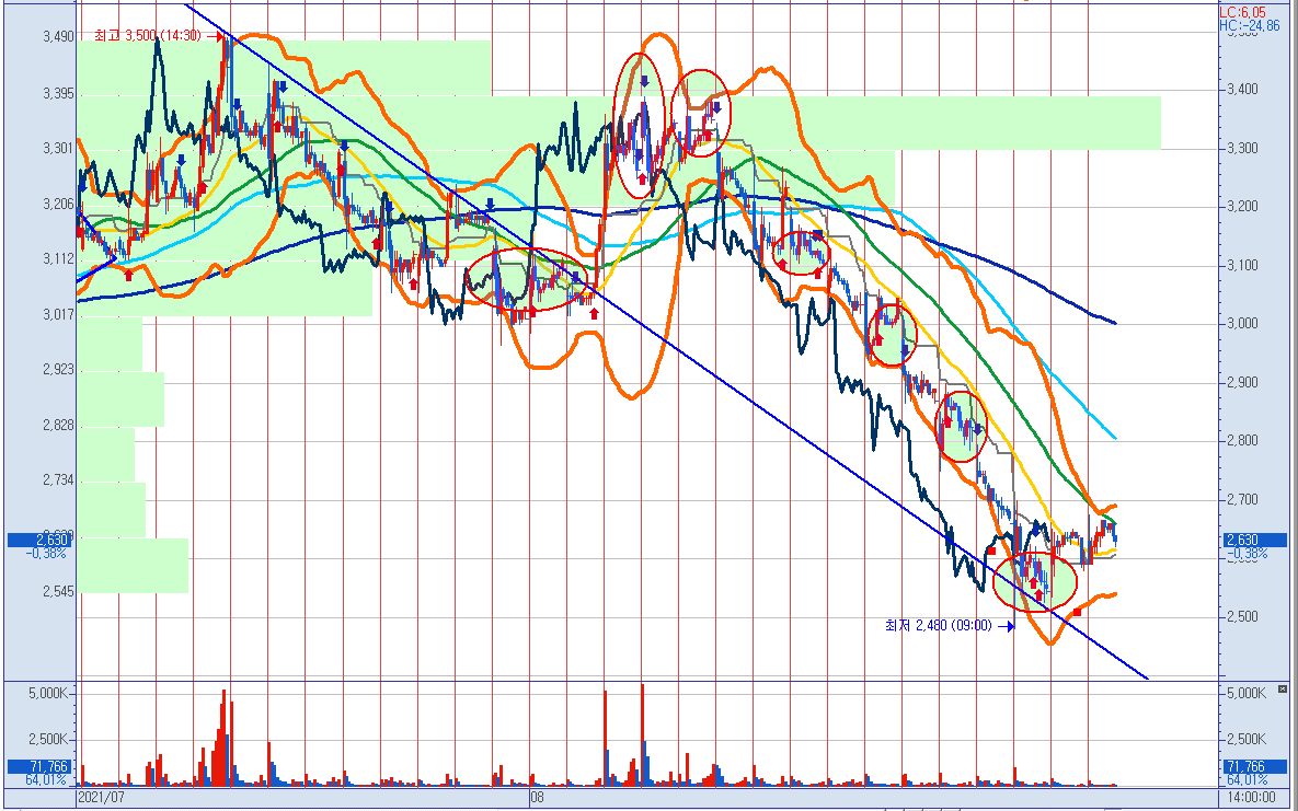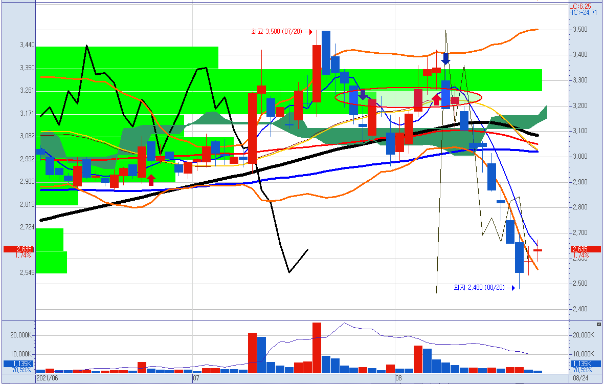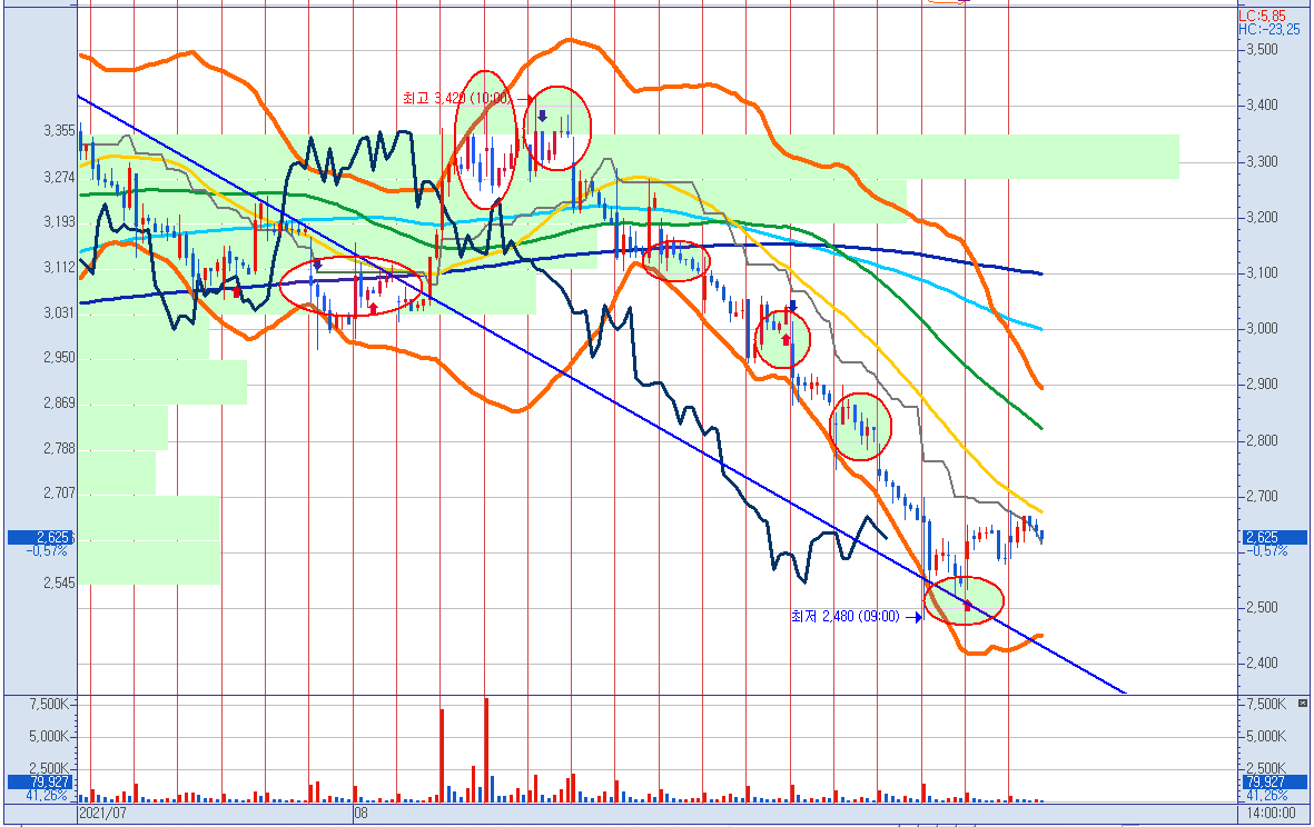 하지만 녹색 이평선을 아직 회복하지 못하고 다시 밀리고 있습니다.