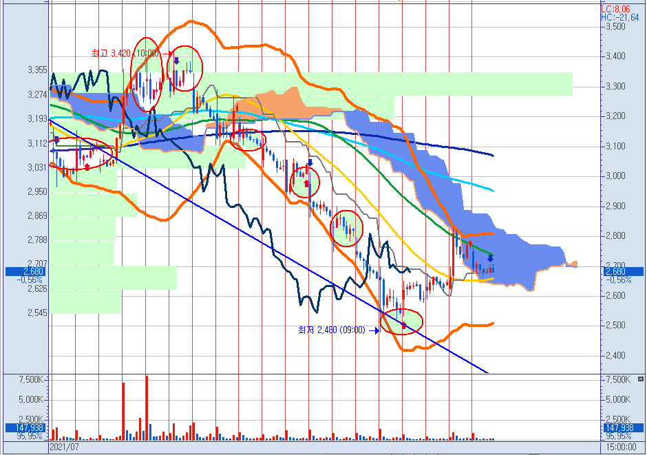 구름대의 저항을 받고 다시 전 저점까지 내려오는 흐름이 예상됩니다.