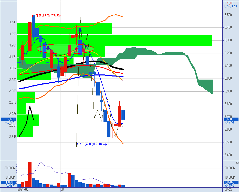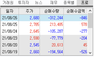 종가는 2680원으로 105원 내려 -3.77%로 마감하였습니다.