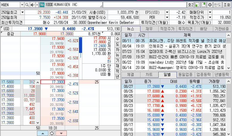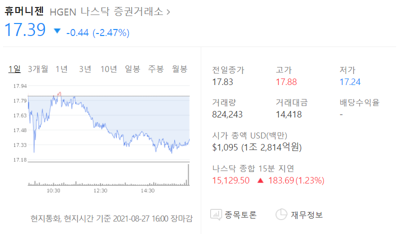 오늘 휴머니젠은 조정을 받아 2.47% 하락한 17.39달러로 마감하였습니다.