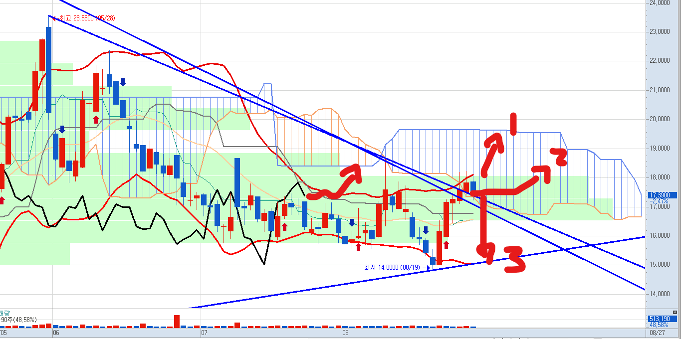 일봉을 보면 이 전에 그려 두었던 하락 추세선을 벗기고