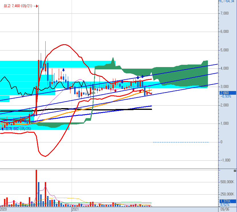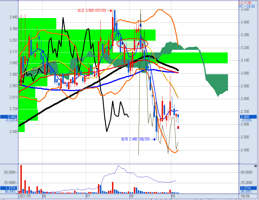 주봉상 볼밴 하단에 걸쳐있고 추세선도 하단입니다.