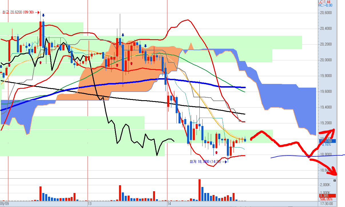 결국 어제 예상했던 시나리오에서 하락하는 쪽으로 방향을 잡았습니다.