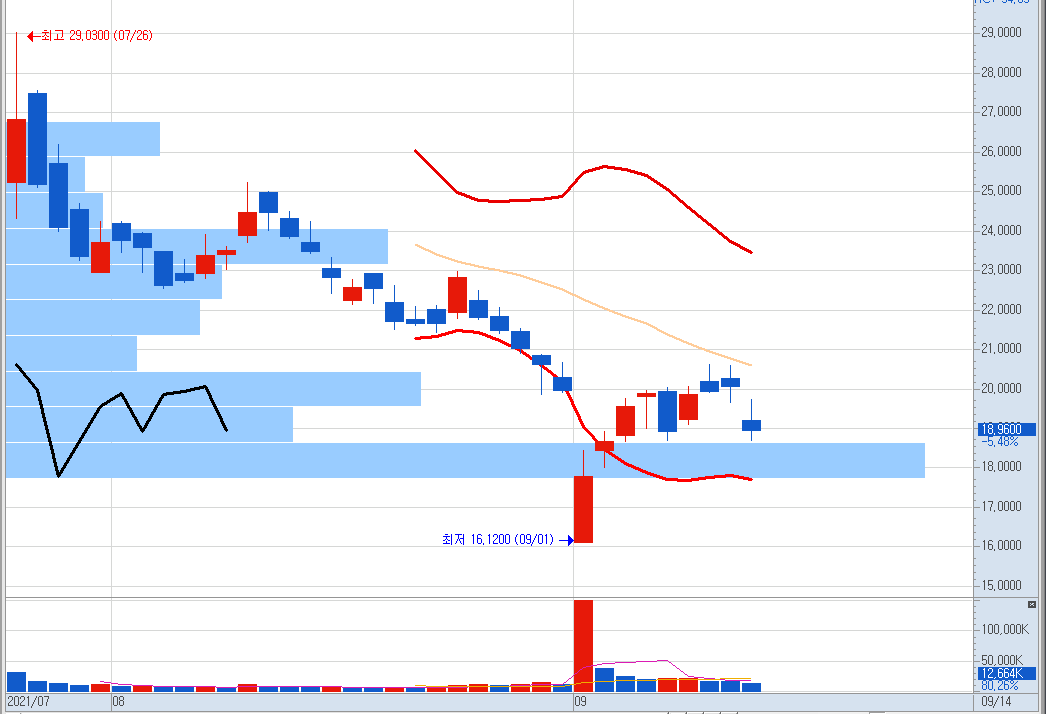 적어도 볼랜져밴드 하단까지는 내려갈 것처럼 보이는 상황입니다.